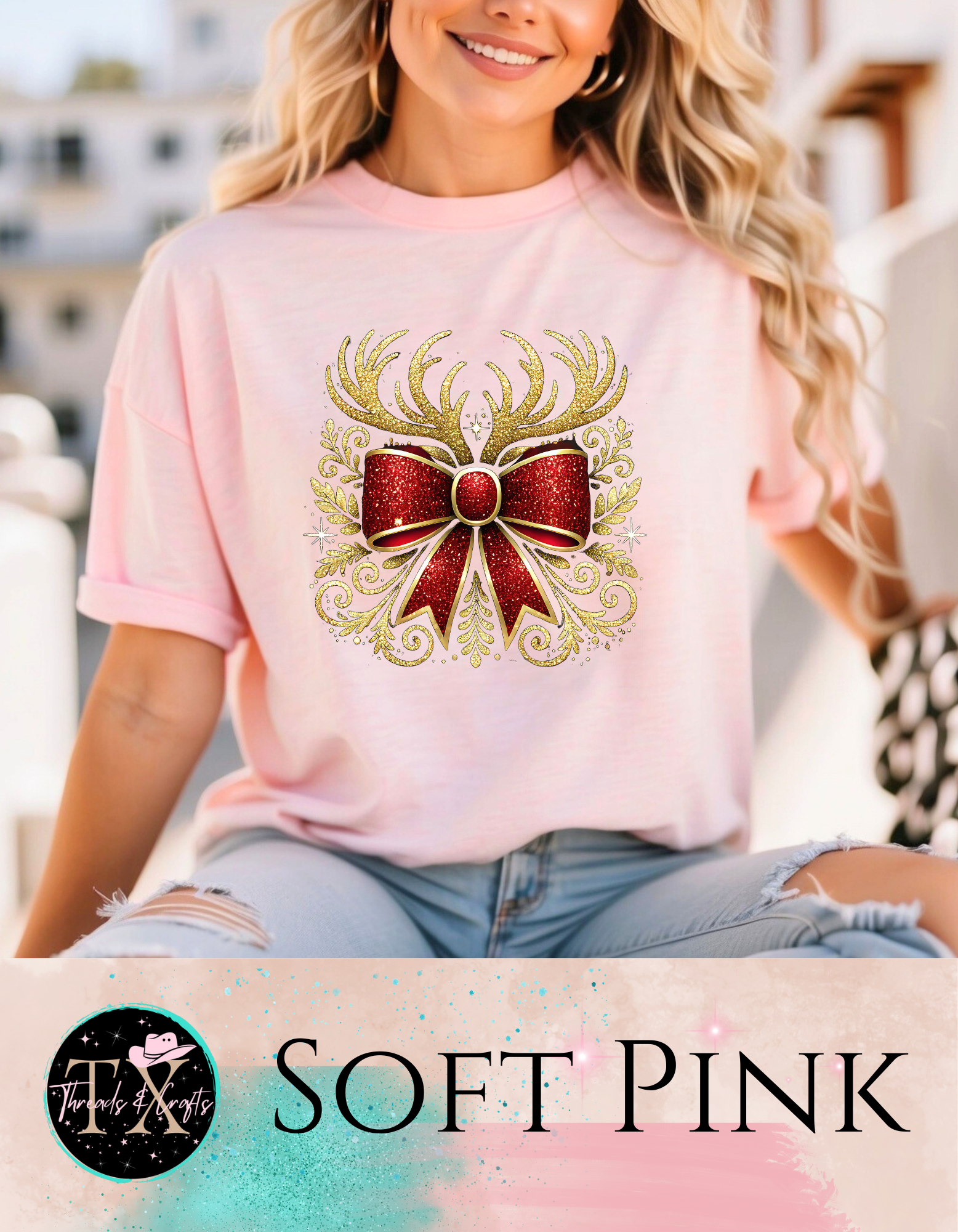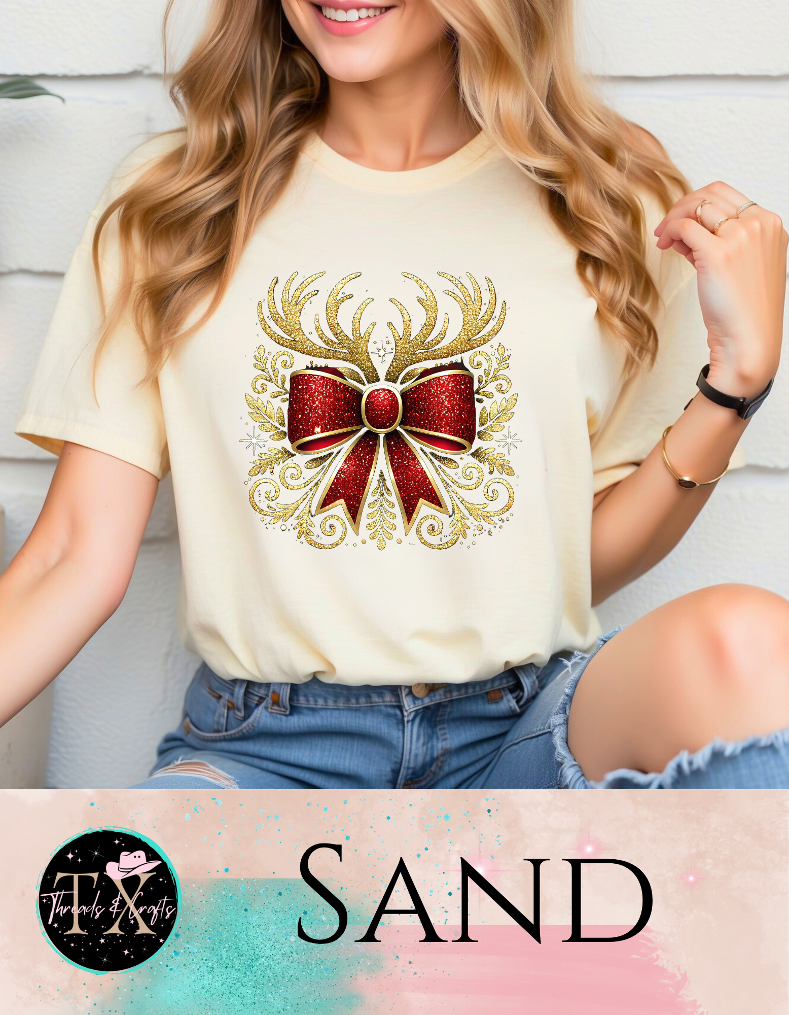 Gold glitter antlers with bow (unisex tshirt)